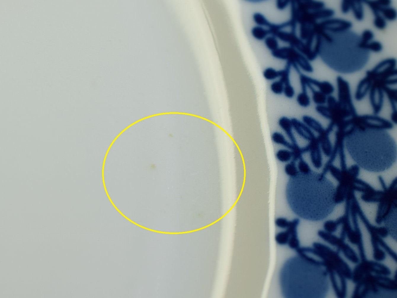 プレートにごく薄い茶色の点状のシミ、ごく小さなペイント飛びが見受けられます。