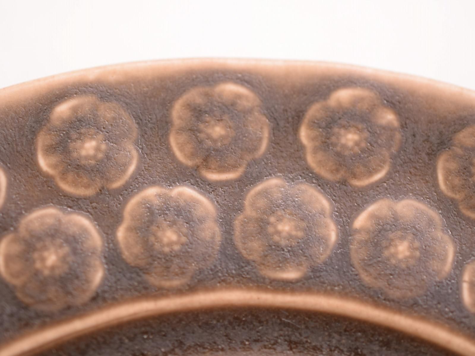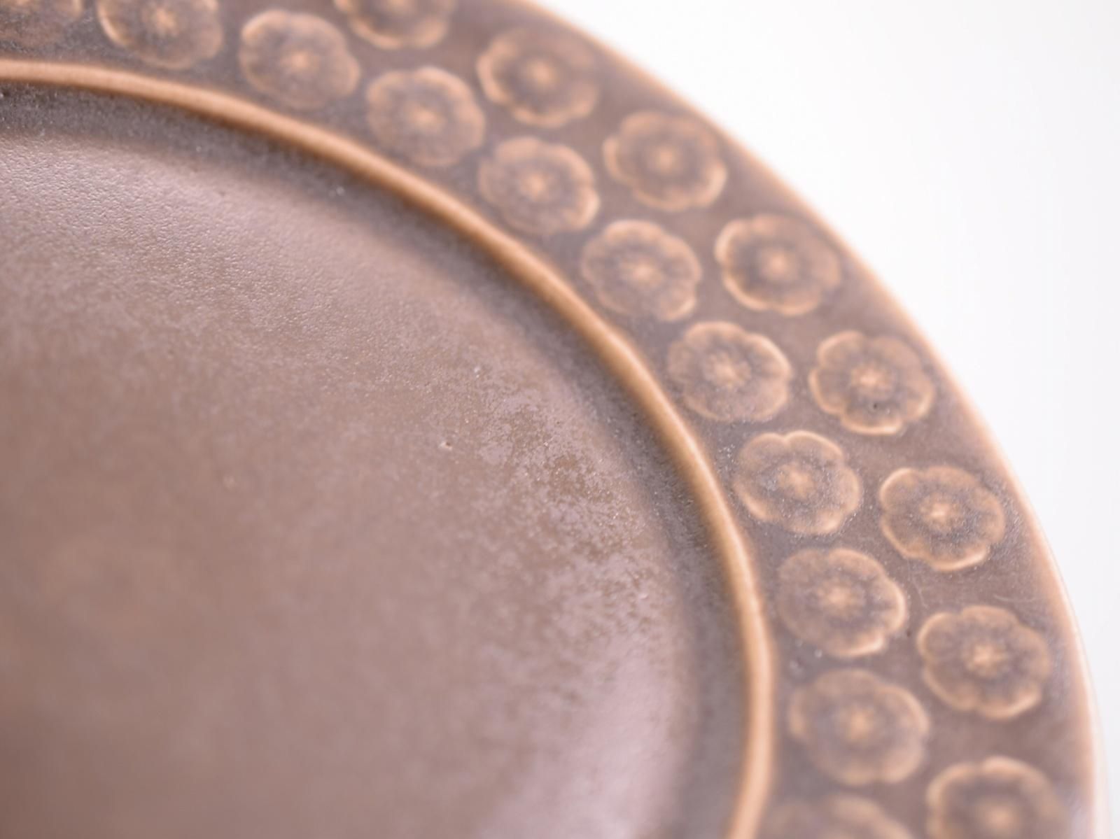 味わい深いブラウンカラーに凹凸のあるPlumの花がデザインされています。