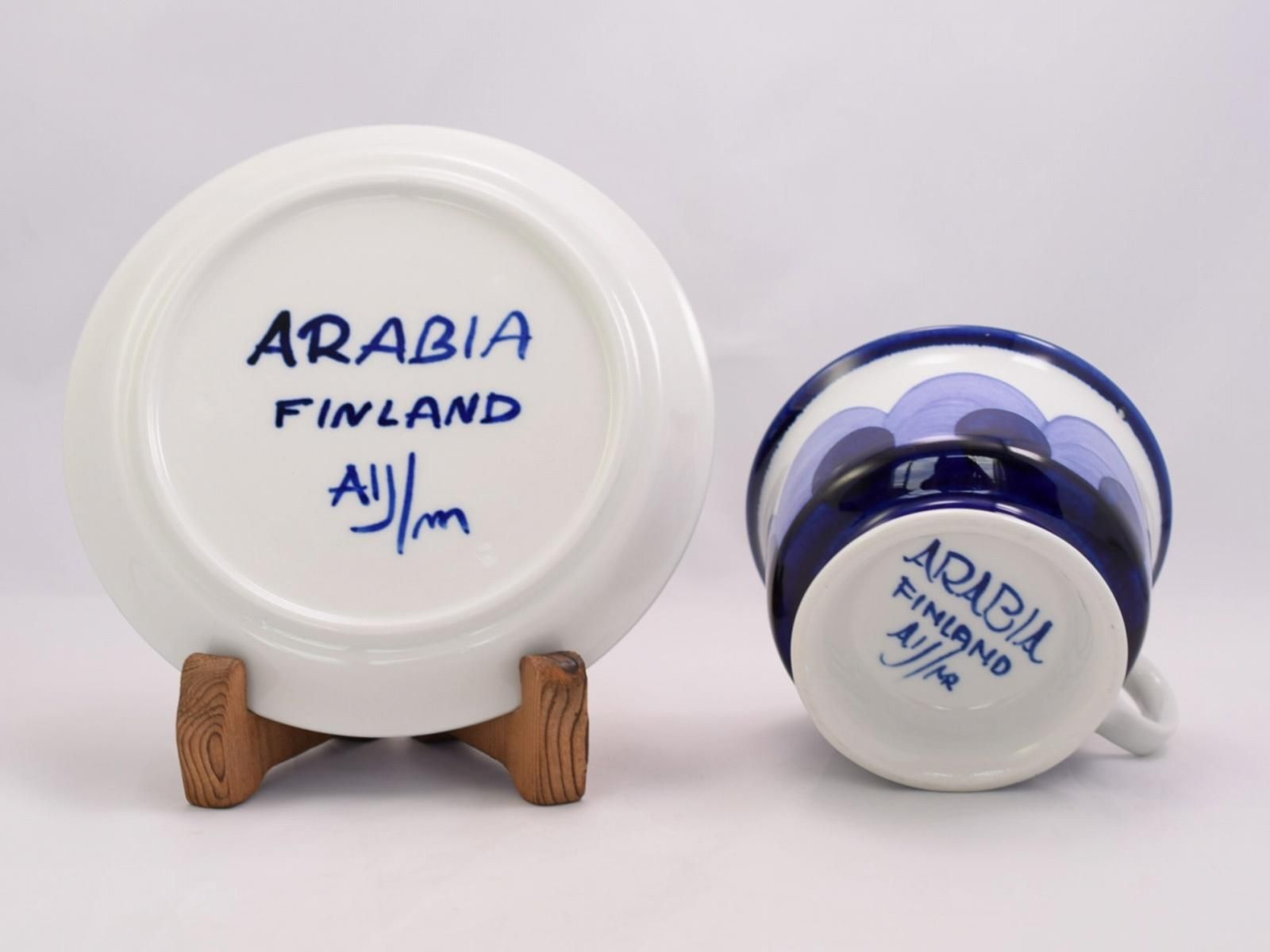 バックスタンプには手描きでARABIAのロゴと、デコレートデザイナー(アンヤ・ヤーティネン・ウィクヴィスト)のイニシャルと絵付師のサインが入っています。