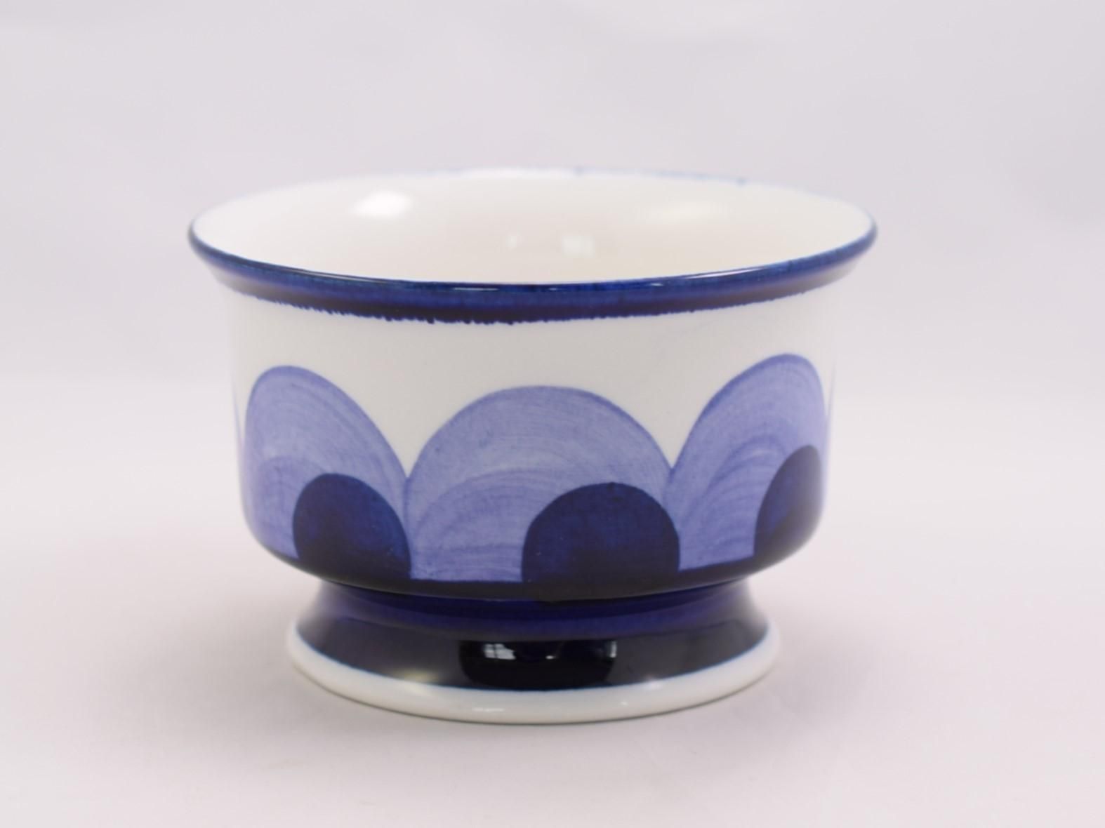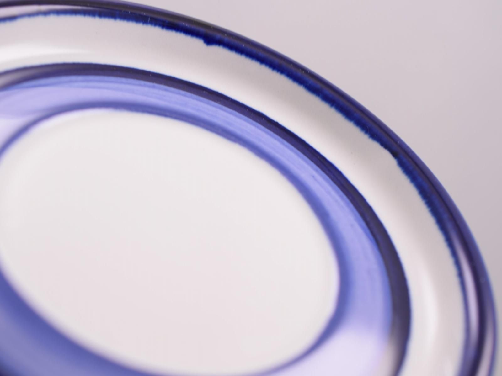 濃いブルーと鮮やかなパープルの2色で、リズミカルな模様がハンドペイントで描かれています。
