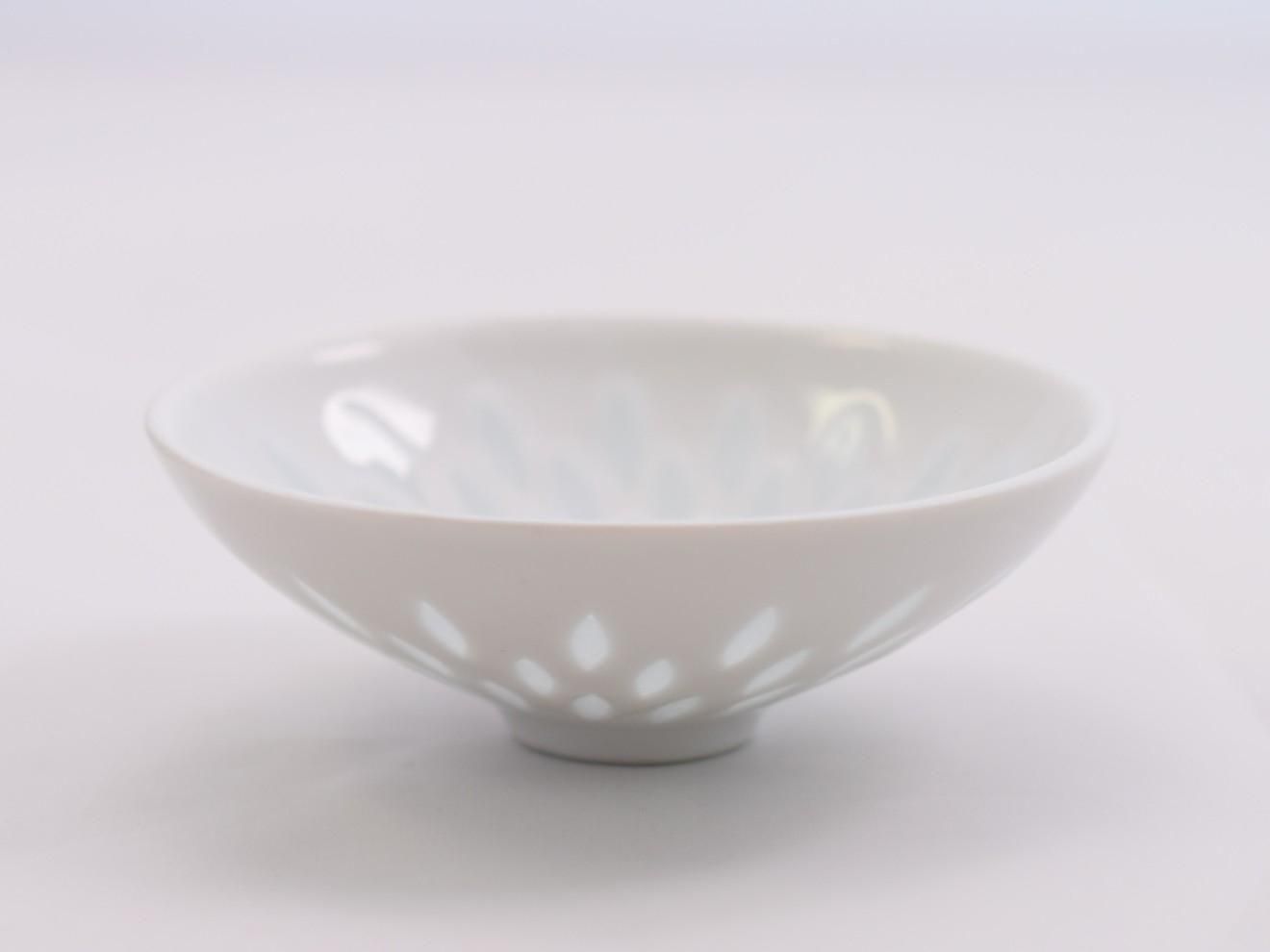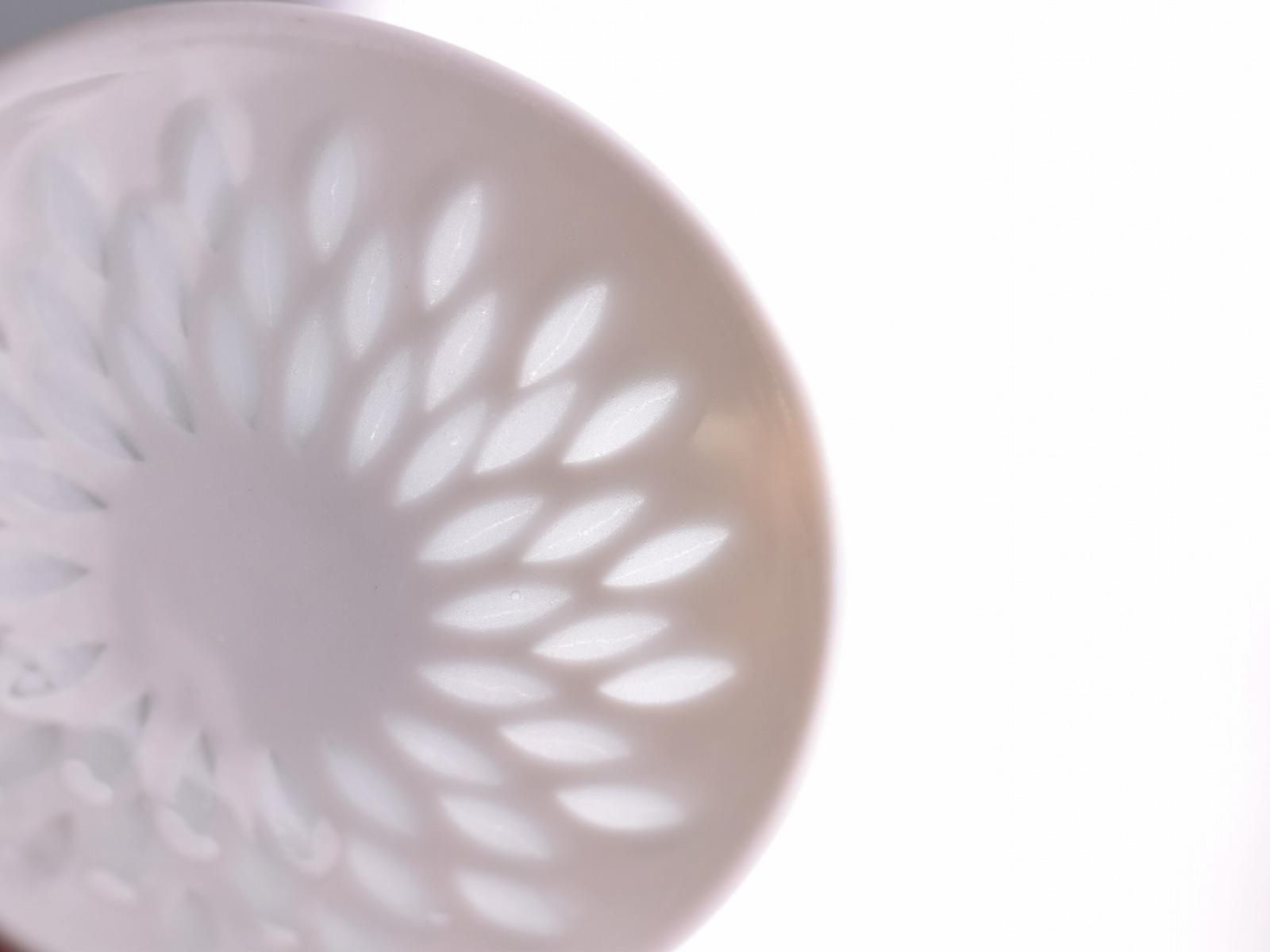 素地を模様の形にくり抜き一度焼成し、薄く釉薬をかけ再度焼成するという、手間と技術が求められる「蛍手」という技法によって作られています。