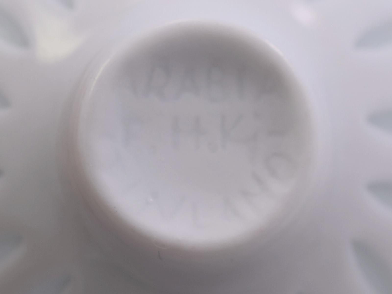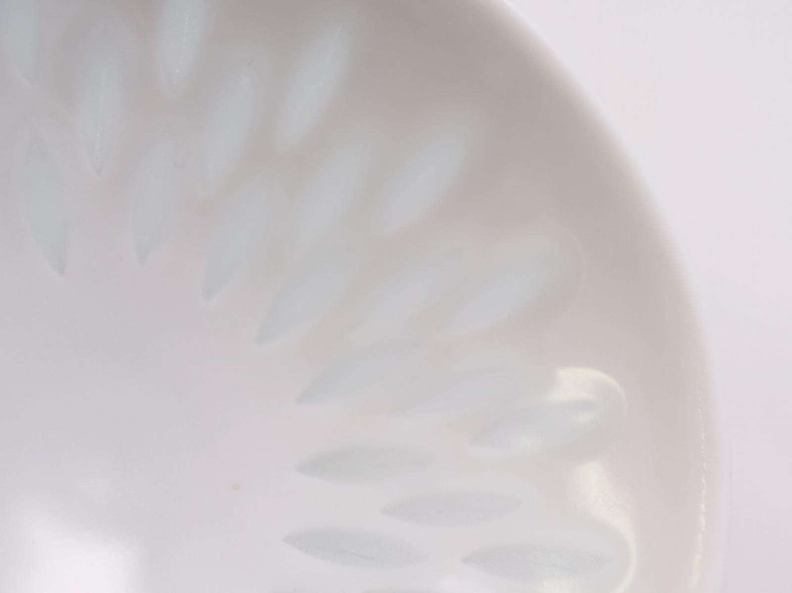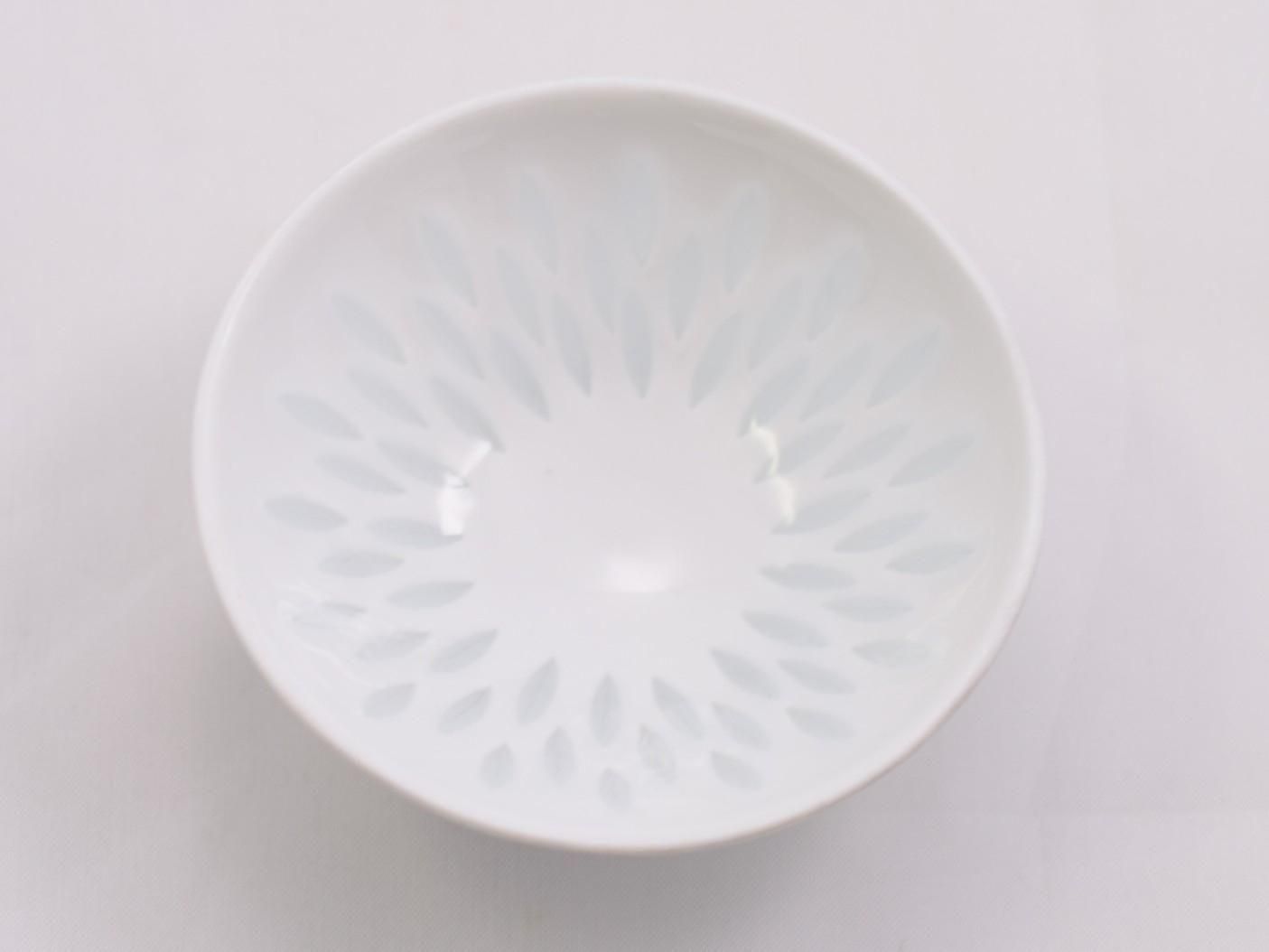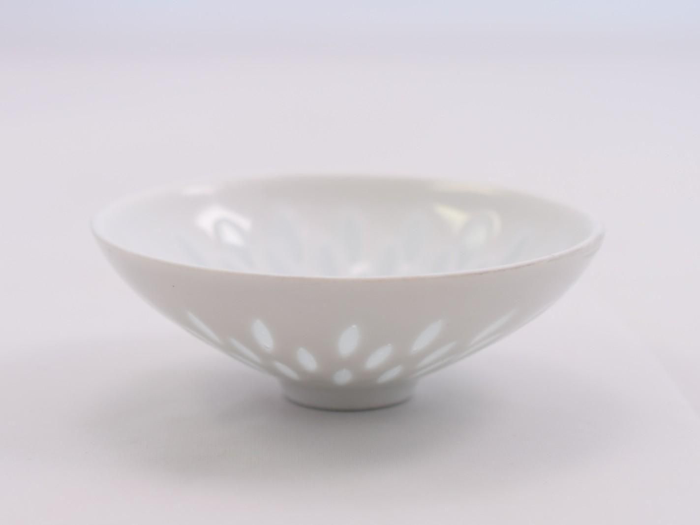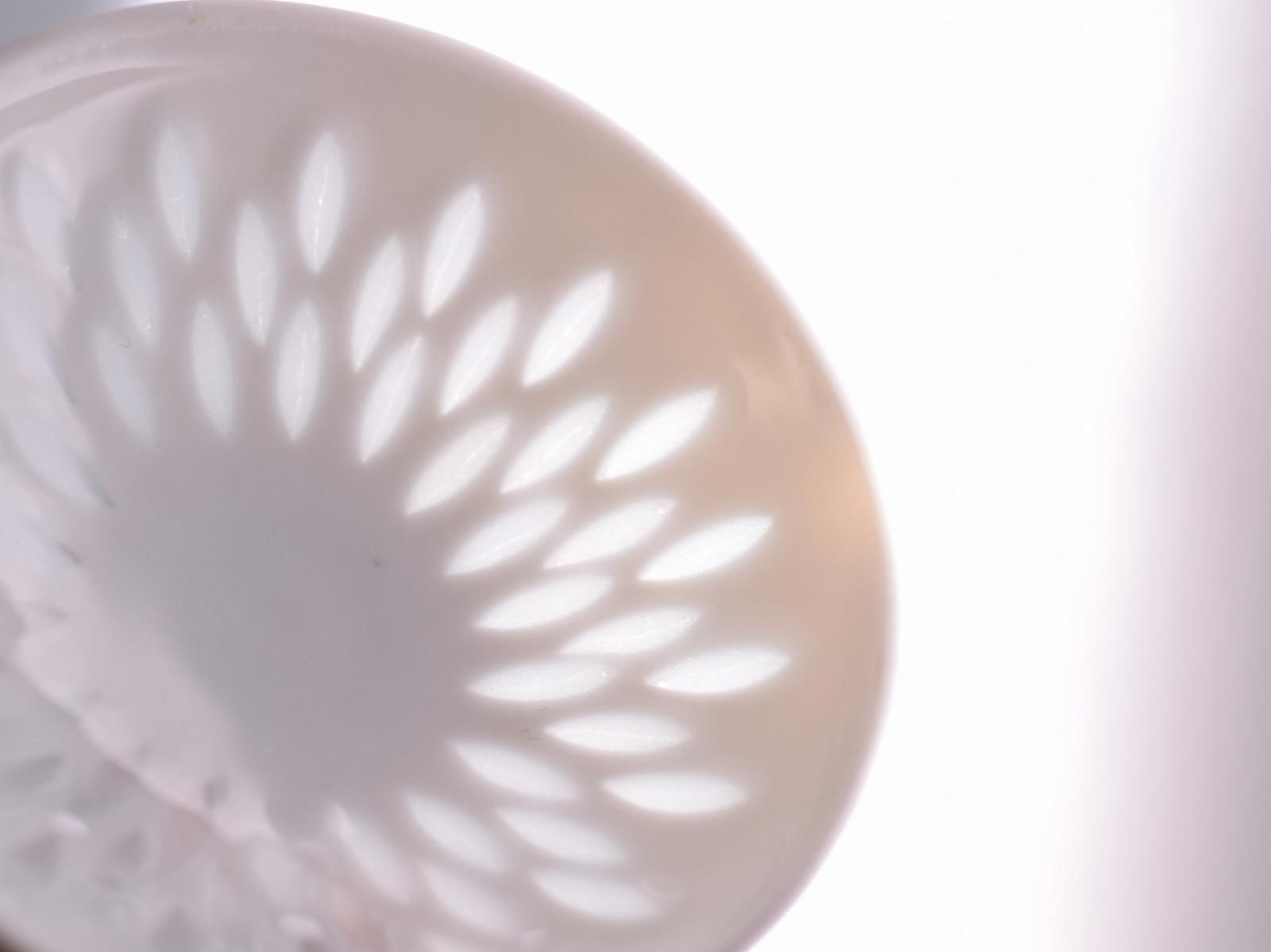 素地を模様の形にくり抜き一度焼成し、薄く釉薬をかけ再度焼成するという、手間と技術が求められる「蛍手」という技法によって作られています。